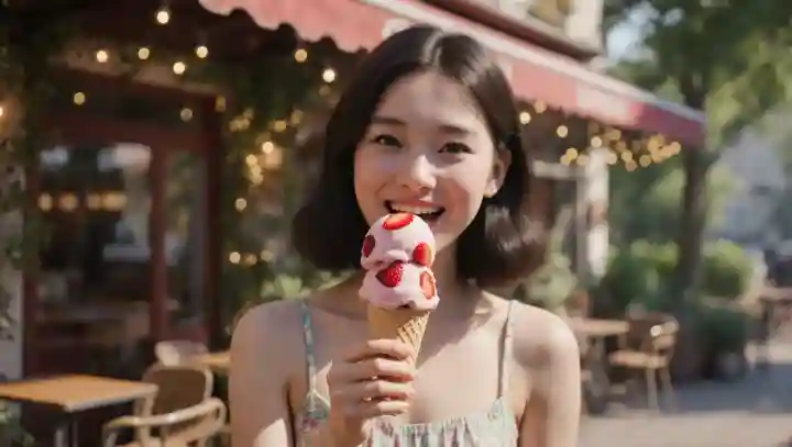 สาว ๆ ชอบไอศครีมสตรอเบอร์รี่แสนอร่อยเพื่อความเพลิดเพลินในฤดูร้อน